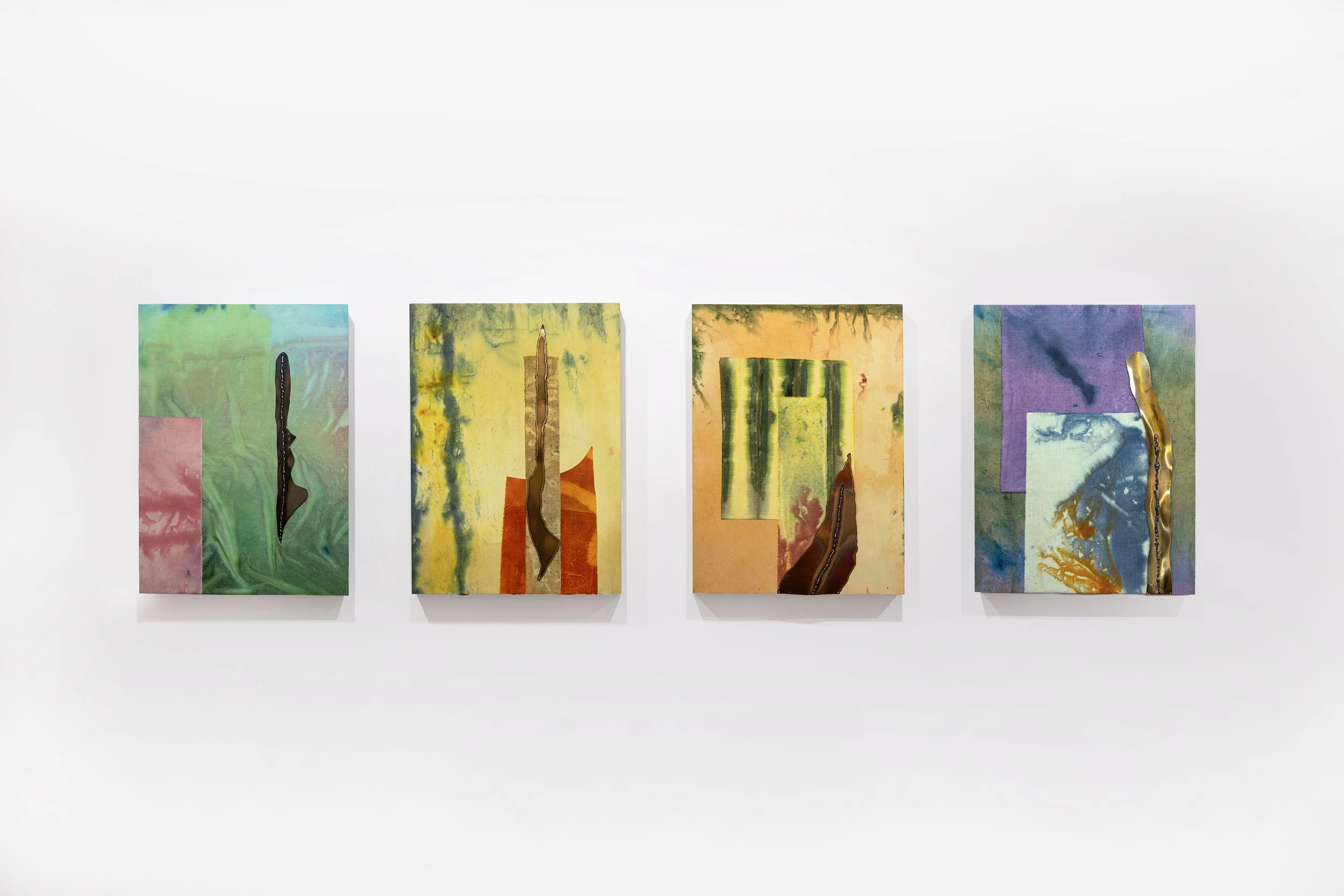 Healing Surfaces, 2023, tissus teintés, métal brûlé sur bois, 60 x 45 x 5 cm